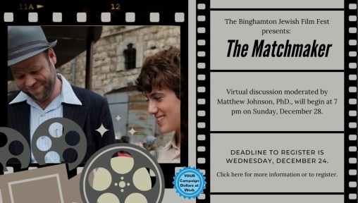Join us for a virtual showing of "The Match Maker." Matthew Johnson, professor of psychology and director of clinical training at Binghamton University, will moderate a Zoom discussion of the film on Sunday, December 28, at 7 pm. Registration is due by Wednesday, December 24.