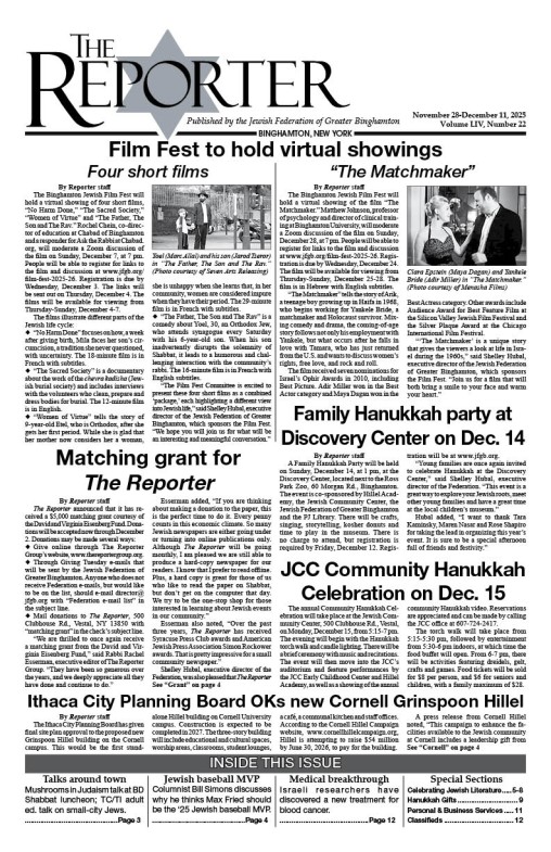 Join us for a virtual showing of four short films, "No Harm Done," "The Sacred Society," "Women of Virtue" and "The Father, The Son and The Rav." Rochel Chein, co-director of education at Chabad of Binghamton will moderate a Zoom discussion December 7 at 7 pm. Deadline to register is December 3.