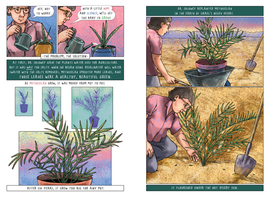 Lemelman’s work places the story into historical perspective, writing about what occurred in Israel during Roman times and how the date palm came to be extinct. He shows the discovery of the seeds during the excavation of Masada and the steps scientists took to bring the seeds back to life, the first of which was planted on January 25, 2005, which was also Tu B’Shevat, the Jewish New Year of the Trees. Since those scientists were women, the book is a perfect gift for girls interested in botany.
