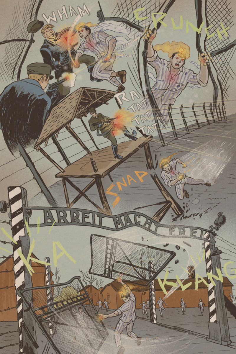 Above, left and right: Pages from Neal Shusterman’s graphic novel “Courage to Dream: Tales of Hope in the Holocaust” with illustrations by Andrés Vera Martinez (Text copyright © 2023 by Neal Shusterman, art copyright © 2023 by Andrés Vera Martínez. All rights reserved. Published by Graphix, an imprint of Scholastic Inc., publishers since 1920.)