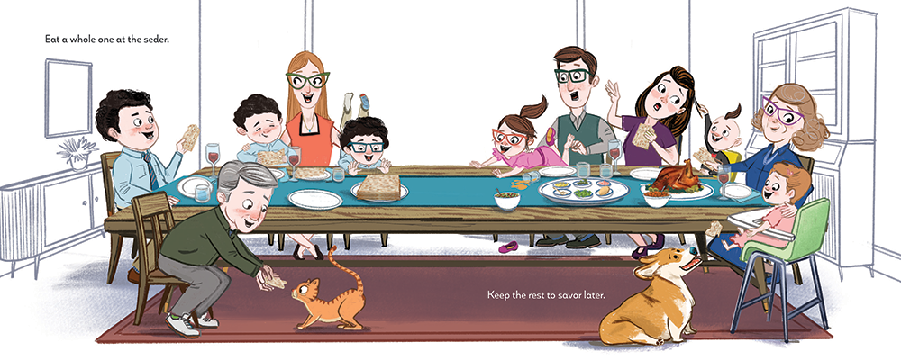 Offsay’s prose is clear and easy to understand, but it was Kirschner’s illustrations that made me smile. For example, when explaining how matzah is made, he enlarges the ingredients and shrinks the humans. The drawing of the seder dinner delightfully shows the organized chaos that occurs during many family gatherings. The work ends with explanations of matzah and Passover, in addition to three matzah related recipes.